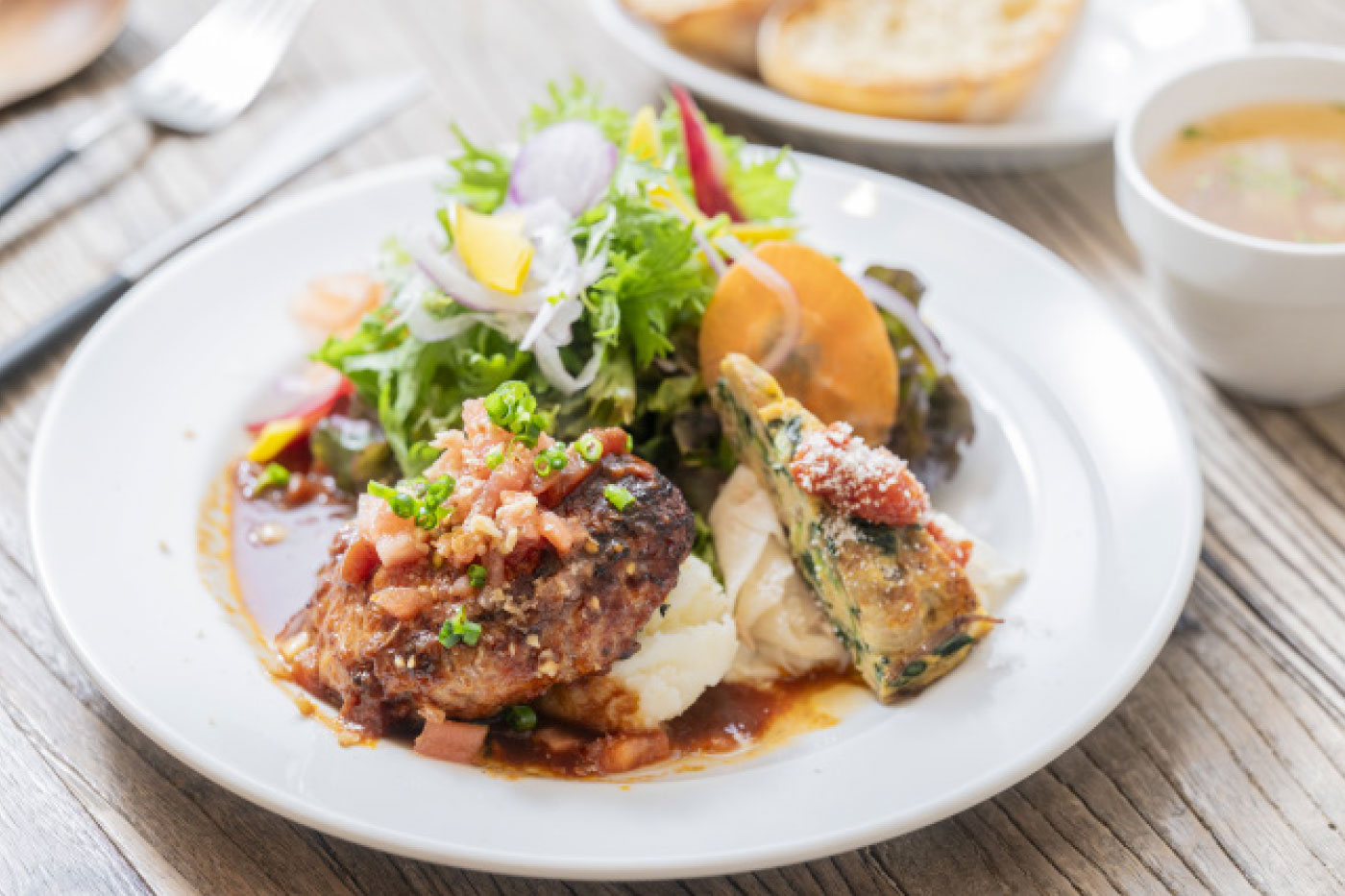 昼食は「畑のGOCHISO」へ。地元産の採れたて野菜をメインに使ったメニューを提供しているカフェレストランです。この日の「季節のプレート」は、茨城産〈美明豚〉と蓮根のハンバーグ。とろけるような甘みが口いっぱいに広がりました。