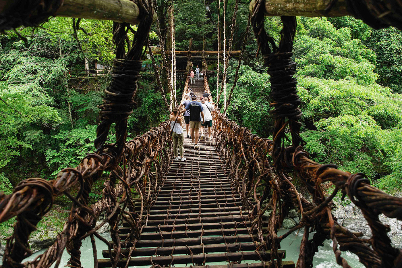 祖谷を代表する観光地・かずら橋は、野生のシラクチカズラ約6トンで編んだ吊り橋です。その昔、渓谷を隔てる集落を行き来する生活道として日常的に使われていたそうです。足下の横木の隙間からのぞく川面に思わず足をすくませつつ、先人たちの暮らしの″軌跡”をたどりました。