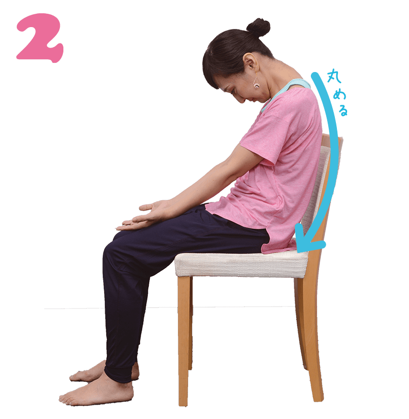 2と3を3回ほど繰り返します。最後は息を吐きながら、ゆっくりとよい姿勢に戻ります。