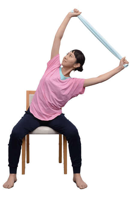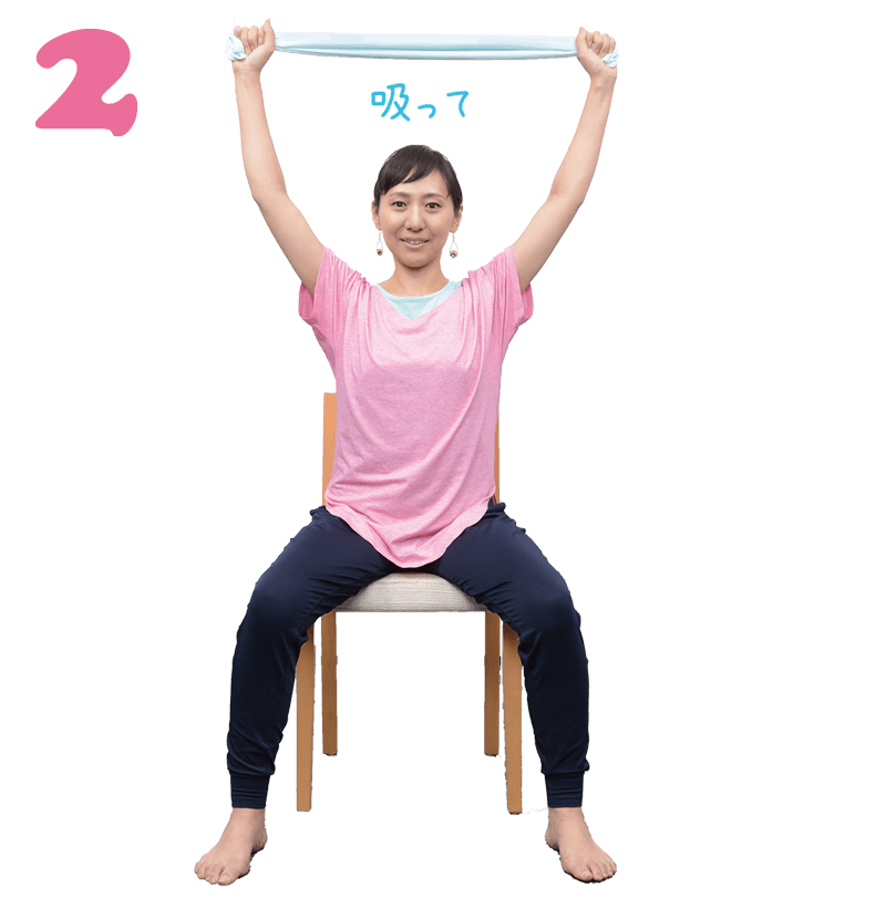 一度、息を吐いて…息を吸いながら両手を持ち上げましょう。つらい場合は、あげられる高さまでで大丈夫です。