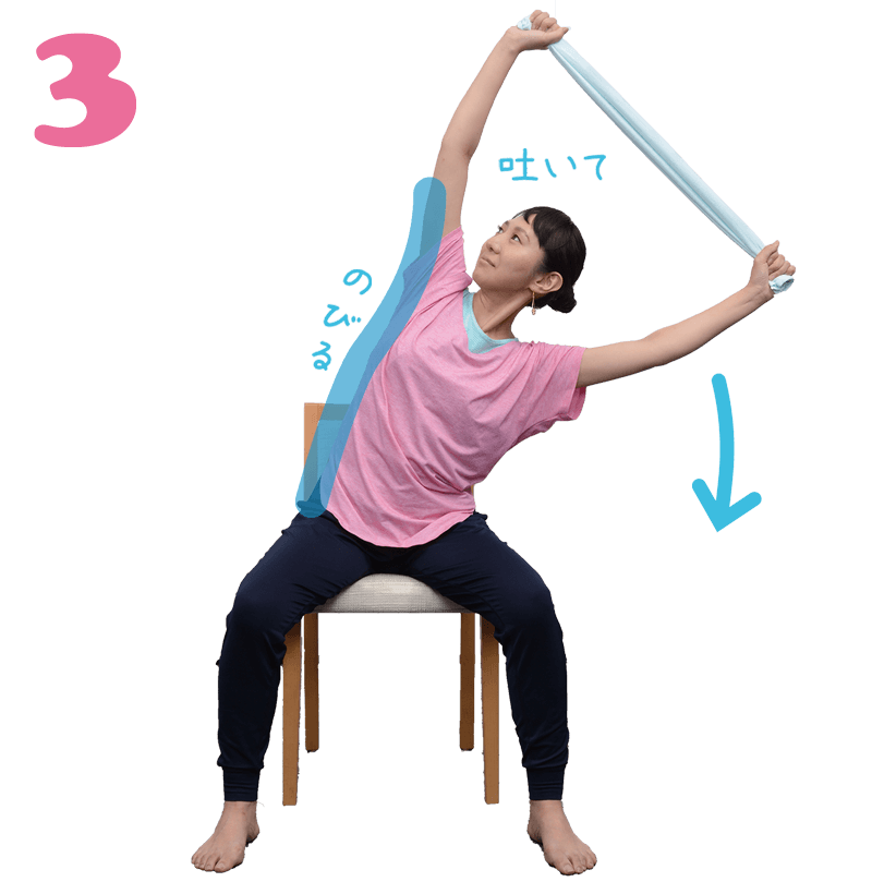 息を吐きながら、左手を左下へおろしましょう。そのまま3回ほど呼吸し、息を吸いながら2の姿勢へ戻ります。右側も同様に行いましょう。