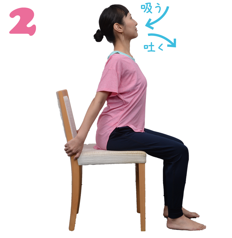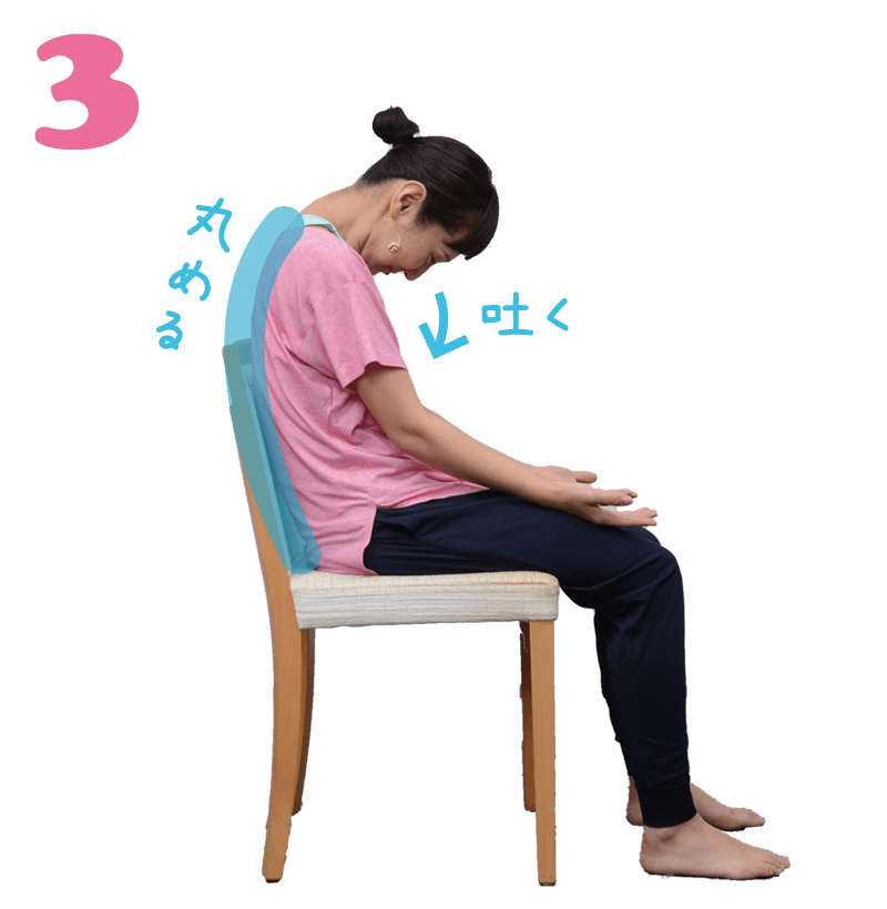 息を吐きながら両手をヒザの上に戻し、背中を丸めます。息を吸いながら、よい姿勢へ戻りましょう。