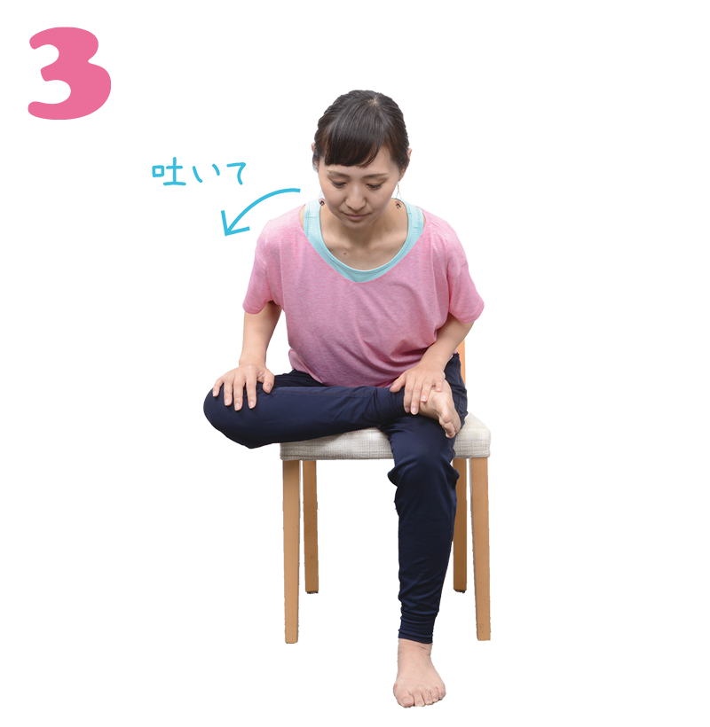 ゆっくりと足をほどき、よい姿勢に戻ります。左側も同様に行いましょう。