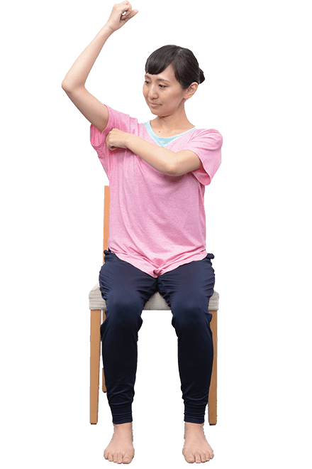 右ひじを曲げて、左手を握りこぶしにして、二の腕からわきの下までをやさしく「トントン」と叩きます。