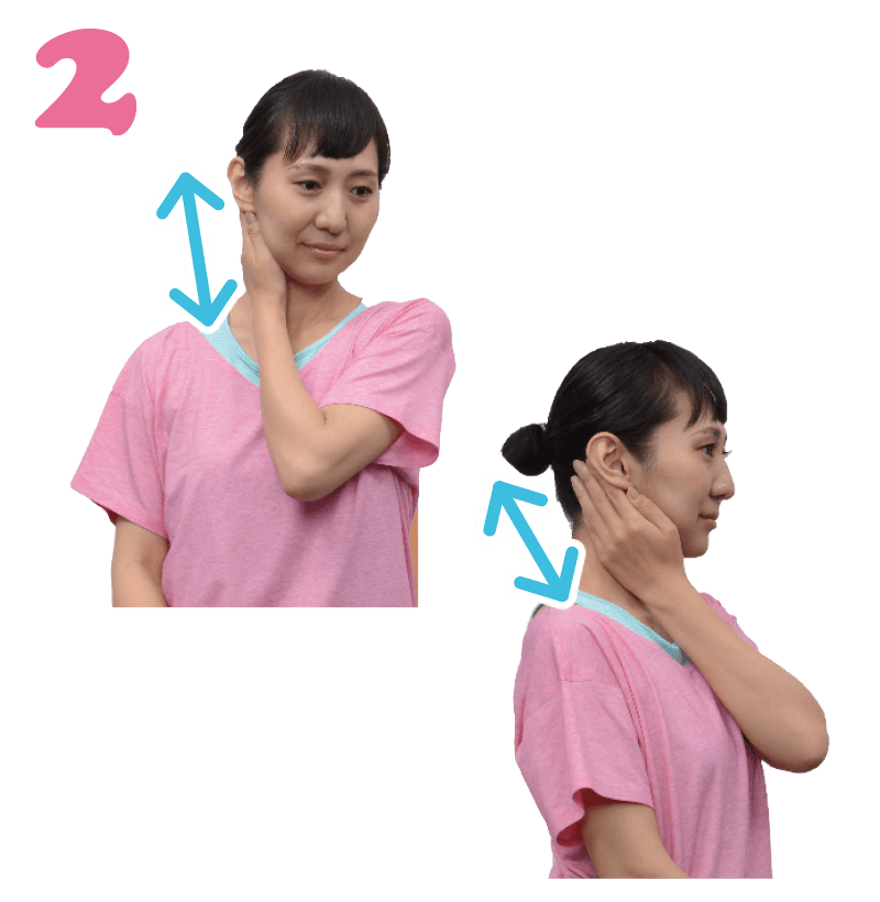 左手で右耳の後ろから鎖骨までをさすりましょう。