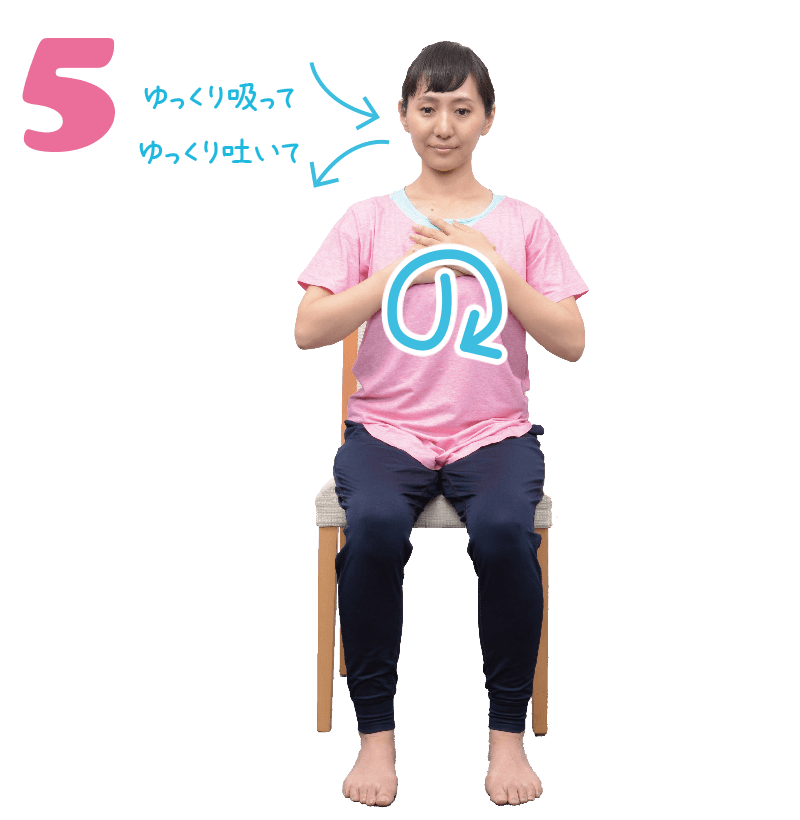 - このまま深い呼吸に入っていきます。一度鼻から息を吐きましょう。鼻から吸ってー、鼻から吐きます。吸ってー、吐いてー、数回繰り返しましょう。