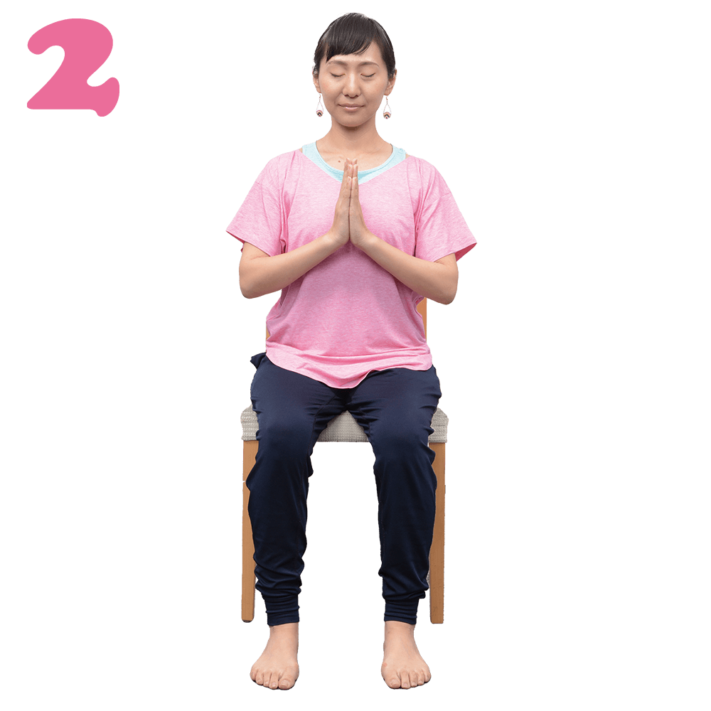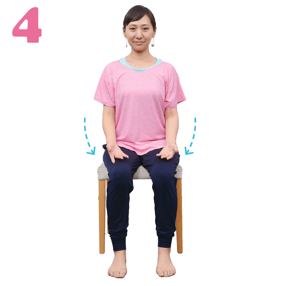 息を吸いながら力を緩め、吐く息に合わせてゆっくりと両手をヒザに降ろしましょう。