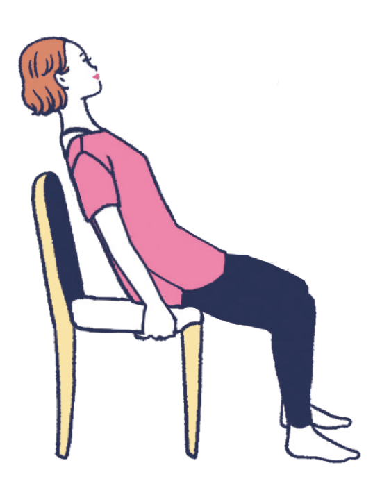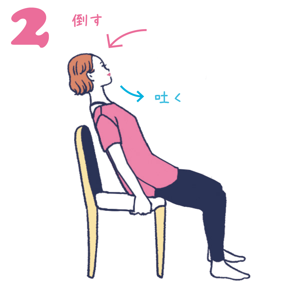 吸う息で背筋を伸ばし、吐く息で上体を背もたれのほうに倒します。