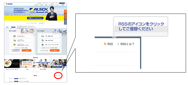 ALSOKの更新情報を、見出しでお知らせする“RSS配信”!RSSならサイトにアクセスしなくても、ALSOKの更新情報が一目でわかるからとても便利。最新の防犯・防災情報をすばやくキャッチで安全安心生活!
