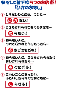 どんな誘い文句でも、どんなやさしい人に見えても、知らない人には近づかない、ついて行かないことを、子どもに繰り返し話しましょう。そして、これも「あんしん教室」で教えている、子どもたちに安心して登下校してもらうための覚え言葉「いかのおすし」を前もって教えておきましょう。