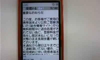 【本文】お客様がご使用の携帯端末より以前ご登録いただいた総合コミュニティサイトから、無料期間中に退会処理がされていないために利用料金が発生し、現在未払いとなっています。本通知から翌日正午までにご連絡を頂いていない場合は、利用規約に従いご登録端末の停止と並行しまして訴訟手続きと回収業者による料金回収に入らせていただきます。退会処理の詳細につきましては、下記までお問い合わせください。株式会社***** 担当** TEL:03-****-**** 営業時間09:00〜18:00
