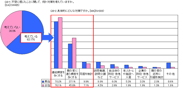 不安に感じたことについて対策を考えている人は63.1%で、「連絡頻度を多く(高く)する」(73.2%)、「親の家に通う頻度を多く(高く)する」(41.5%)といった、今すぐにできる対策を講じようとしていることがわかりました。