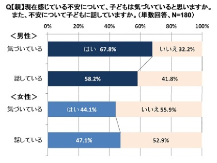 【親】が現在感じている不安に関することについて、【親】に「子どもは気づいていると思うか」また、「不安について子どもに話したか」聞いたところ、男性は、不安について子どもに話さなくても、子どもは気づいていると思っている方が多く、女性は、半数以上が不安について子どもに話していないし、気づいてもいないと思っていることが分かりました。
