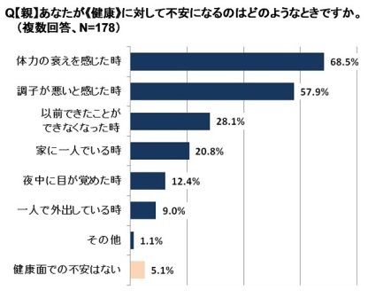 【親】に、どのようなときに不安を感じるか聞いたところ、《健康》では「体力の衰えを感じたとき」(68.5%%)、「調子が悪いと感じたとき」(57.9%)との回答が続きました。