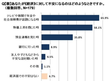 《経済》では「テレビや新聞で年金や社会保障費が話題になるとき」(65.9%)や「物価上昇を感じたとき」(58.1%)に不安を感じると回答しました。