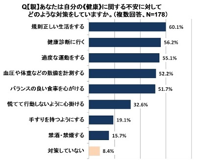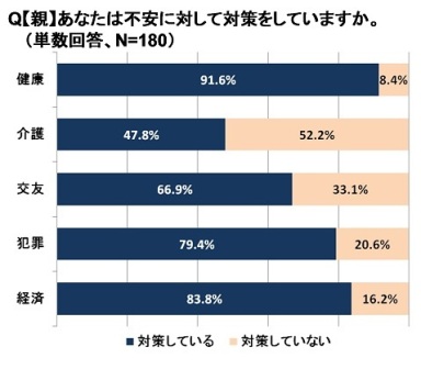 親】に、不安に対してどのような対策をしているか聞いたところ、《健康》 《経済》 《犯罪》に関しては、多くの方が対策を講じていましたが、《介護》に関しては、約半数の方が対策をしていないことがわかりました。