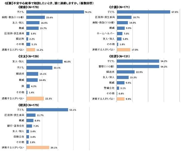 【親】に、不安や心配事があって誰かに相談したいとき、誰に相談するかを聞いたところ、ほとんどの項目で「子ども」に連絡すると回答しましたが、《経済》では、「連絡する人がいない」と回答した方が最も多い(29.1%)という結果でした。