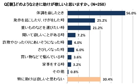 また、どのようなときに助けが欲しいか聞いたところ、「体調を崩したとき」(56.0%)が多かったものの、「特に助けは欲しいと思わない」と回答した方も30.4%いました。