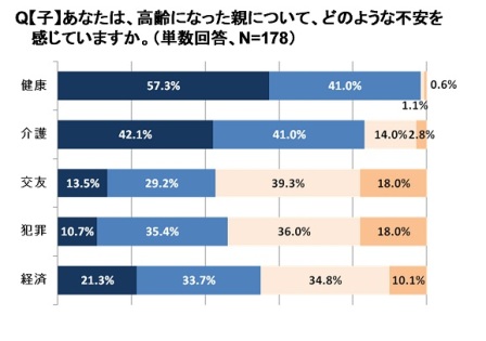 一方、高齢になった親のことで感じている不安を【子】に聞いたところ、《健康》 《介護》 《経済》の順に高いという結果になりました。