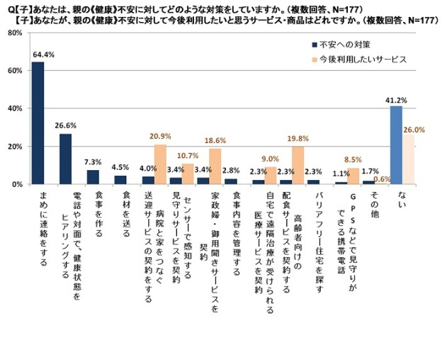 一番対策を行っている《健康》に関して具体的に聞いたところ、「まめに連絡をする」方が64.4%、「健康状態をヒアリングする」方が26.6%で、高齢者向けサービスに加入するという意見はわずかでした。