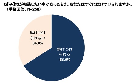 【子】に、親が相談したいことがあったとき、すぐに駆けつけられるか聞いたところ、66.0%の方が「駆けつけられる」と回答しました。