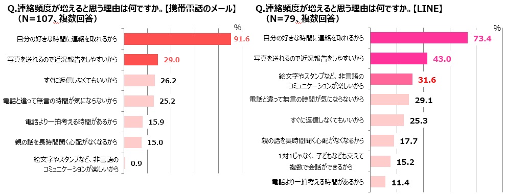 携帯電話のメールやLINEを使ってくれたら連絡頻度が増えると思う理由について聞いたところ、いずれも「自分の好きな時間に連絡を取れるから」、「写真を送れるので近況報告をしやすいから」の順になりました。また、LINEと回答した人の31.6%は、「絵文字やスタンプなど、非言語コミュニケ―ションが楽しいから」を挙げました。