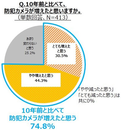 74.8%は「10年前と比べて防犯カメラが増えた」と感じており、