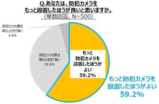 さらに、「あなたは、防犯カメラをもっと設置したほうが良いと思いますか」と質問したところ、半数以上となる59.2%の人が「もっと防犯カメラを設置したほうが良い」と考えており、防犯カメラはただ定着しているのでなく、人々から信頼され、受け入れられていることが分かりました。