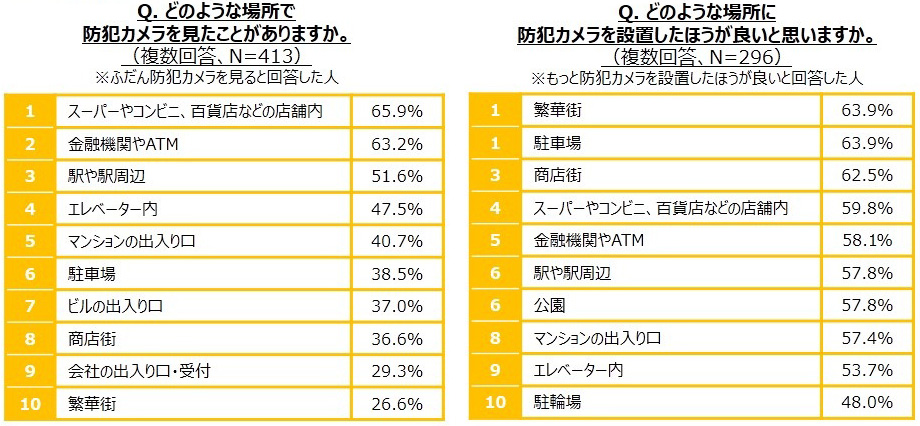 防犯カメラを見たことがある場所と、設置したほうが良いと思う場所について聞いたところ、見たことがある場所は「スーパーやコンビニ、百貨店などの店舗内」(65.9%)、「金融機関やATM」(63.2%)といった建物内が多く、「駅や駅周辺」(51.6%)が続きました。一方、設置したほうが良いと思う場所は、「繁華街」(63.9%)、「駐車場」(63.9%)、「商店街」(62.5%)に回答が集まりました。