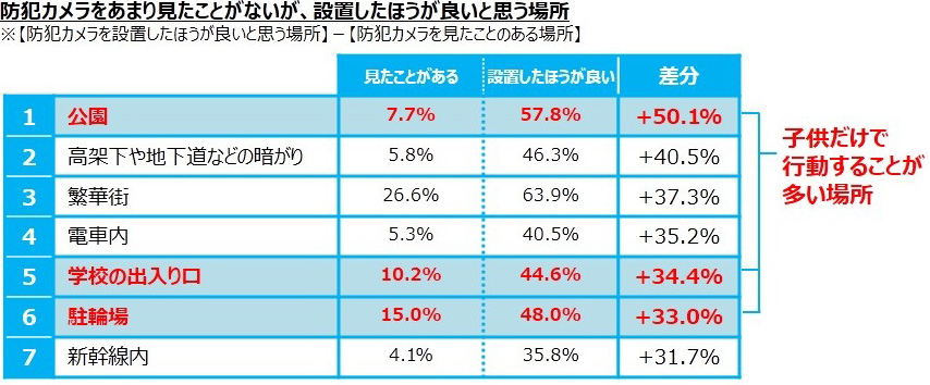 特に、子どもだけで行動することの多い「公園」(+50.1%)、「学校の出入り口(+34.4%)、「駐輪場」(+33.0%)などが上位にランクインし、大人でもドキドキしながら通ることが多い「高架下や地下道などの暗がり」(+40.5%)、事件が起きた時に逃げ場のない「電車内」(+35.2%)や「新幹線内」(+31.7%)にも、設置を 求める声が高いことがわかりました。2015年6月に東海道新幹線の車内で起きた火災事件は、社会に大きな衝撃を与え、公共交通機関での防犯カメラ設置の関心を高めたのかもしれません。