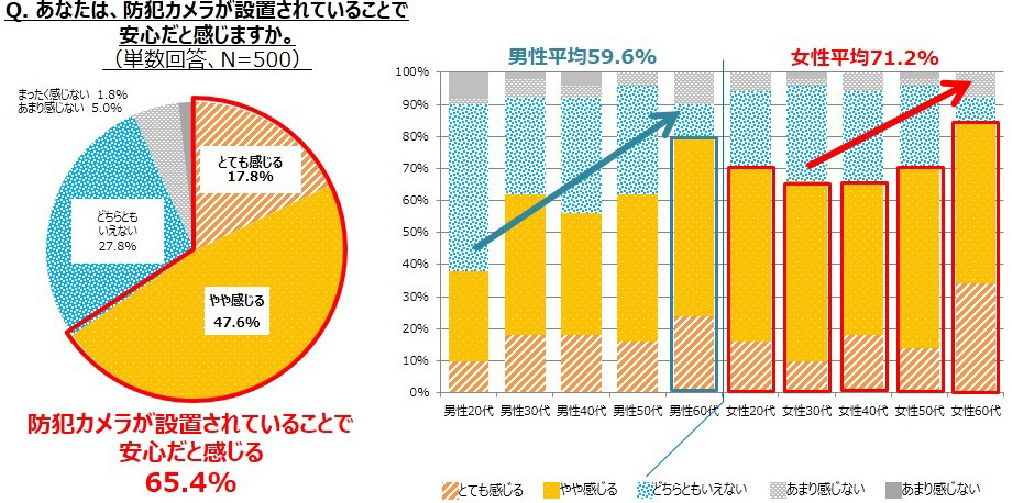 防犯カメラが設置してあることをどのように感じているか質問したところ、安心感を得ている人は全体では65.4%でした。特に女性では71.2%と高く、また、年齢が上がるほど防犯カメラに安心感を得ており、60代女性では84.0%の人が安心だと回答しました。