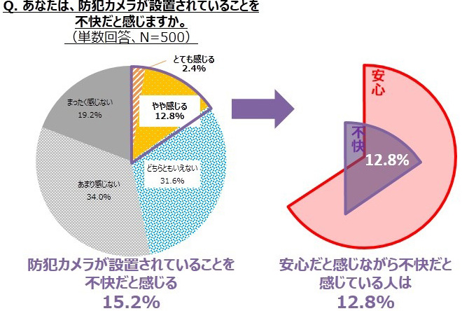 一方、防犯カメラを不快に感じている人は15.2%でしたが、安心感と不快感をともに感じている人は12.8%で、不快と感じている人の多くが、同時に安心感も得ており、防犯カメラに対して複雑な感情があることが分かりました。