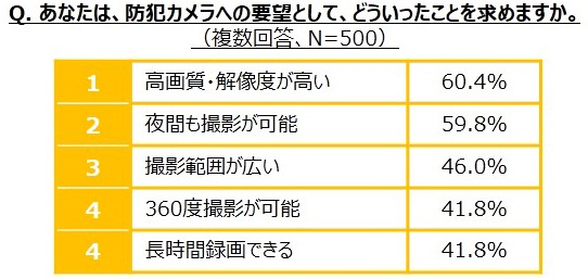 防犯カメラに求める機能は「高画質・高解像度」「夜間撮影」「広い撮影範囲」