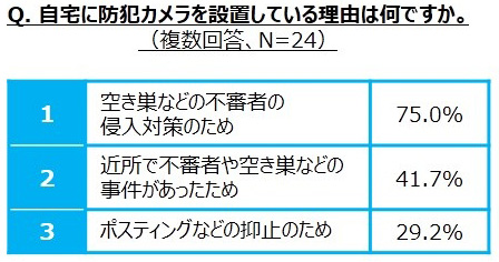 自宅に防犯カメラを設置しているのは、全体の22.0%でした。このうち、集合住宅住まいなどで最初から防犯カメラが設置してあった人を除き、自分で防犯カメラを購入して設置した人はわずか4.8%に止まりました。防犯カメラを設置した理由は、「空き巣などの侵入者対策のため」(75.0%)が最も多く、「近所で不審者や空き巣などの事件があったため(41.7%)と続きました。