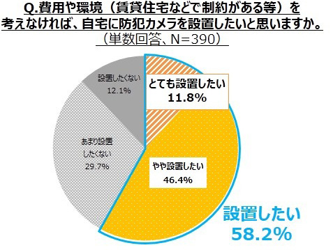 自宅へ防犯カメラを設置する人はまだまだ少数派ですが、自宅に防犯カメラを設置していない人の半数以上(58.2%)は費用や環境の制約を考えないなら設置したいと考えており、防犯カメラに対する関心が高いことが分かりました。