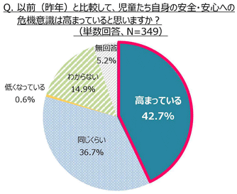 以前(昨年)と比較して、児童たちの安全・安心への危機意識が高まっていると感じているか聞いたところ、42.7%の先生が「高まっている」と感じており、「以前と同じくらい」(36.7%)を上回りました。 奈良県のリサイクルショップで小学校6年生の女児が連れ去られた事件(2015年7月)や、大阪府寝屋川市で中学生の男女が連れ去られた事件(同8月)が発生し、大きく報じられたことも、児童の危機意識を高めるきっかけになったと考えられます。