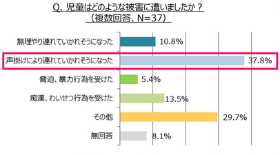 具体的に、どのような被害に遭ったか聞いたところ、37.8%の先生が「声掛けにより連れて行かれそうになった」と回答しました。声掛けの内容に関しては、子どもが興味を持つもので誘う「興味系」(28.6%)と、子どもの親切心につけ込む「親切系」(28.6%)が同率で最も多く、「困っている人がいたら助けよう」と教えられている子どもの無垢な心を踏みにじる、卑劣な手口が明らかになりました。
