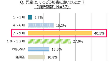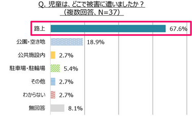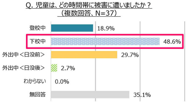 現在担当しているクラスに、過去に声掛けや連れ去りなど、危険な目に遭った経験のある児童がいると回答した先生に、被害に遭った時間帯・場所・時期を聞いたところ、時間帯では、保護者や先生の目が届きにくい「下校中」(48.6%)、「外出中(日没前)」(29.7%)の順となりました。被害に遭った場所は、「路上」(67.6%)が最多となり、「公園・空き地」(18.9%)が続きました。被害に遭った時期は、7~9月に集中しました。