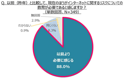 以前(昨年)と比較して、現在のほうがインターネットに関するリスクについての教育が必要と感じるか、という質問に対して、88.0%の先生が「以前より必要に感じる」と回答しました。