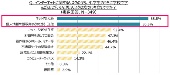 小学校のうちに学んだほうがよいと考える内容について聞いたところ、「ネット内いじめ」(88.8%)、「個人情報や顔写真などの公開、送信」(80.8%)と、SNSなどのインターネット上のコミュニケーションに関する内容が特に必要と考えられていることがわかりました。