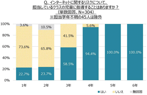 実際に、児童にインターネットに関するリスク教育をしているか聞いたところ、小学校高学年の担任では全員が指導すると回答しました。一方、小学校低学年では2割程度にとどまっており、学年が上がるにつれて指導している比率が増加する傾向が見られました。