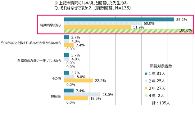 教えていないと回答した先生にその理由を聞いたところ、「時期尚早だから」という意見が最多でしたが、「どのようなことを教えたらいいかわからない」「各家庭の方針に一任しているから」という意見も少数ながらありました。