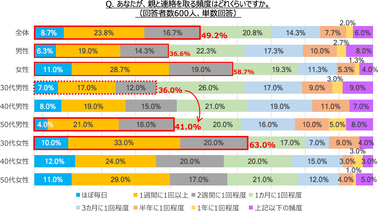 別居している70歳以上の親(以下、親)と連絡を取り合う頻度を聞いたところ、約半数(49.2%)の人が2週間に1度以上の頻度連絡を取り合っており、男性より女性のほうが頻繁に連絡を取り合う人が多いようです。特に30代の女性は、ほかの年代・性別より高い頻度で連絡を取り合っていることがわかりました。男性は年齢が上がるほど、親と連絡を取り合っている傾向があることが分かりました。