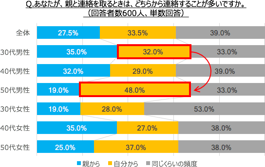 男性は年齢が上がると、自分から高頻度で親に連絡