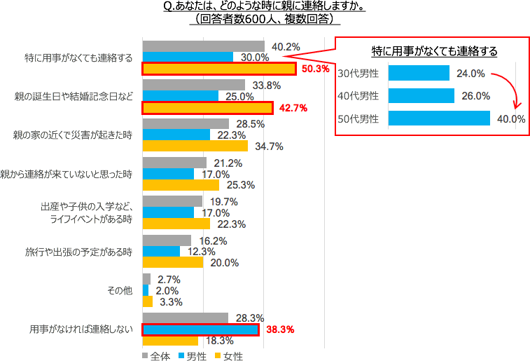 どのような時に親に連絡するか聞いたところ、女性の半数が「特に用事がなくても連絡する」(50.3%)と回答し、「親の誕生日や結婚記念日など」(42.7%)、「親の家の近くで災害が起きた時」(34.7%)の順となりました。一方、男性は「用事がなければ連絡しない」(38.3%)という人が最も多い結果となりました。しかし、年齢が上がると「特に用事がなくても連絡する」男性が増え、30代では24.0%でしたが、50代男性では40.0%に増加しました。