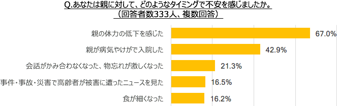 不安を感じたタイミングを聞いたところ、「親の体力の低下を感じた」(67.0%)、「親が病気やけがで入院した」(42.9%)、「会話がかみ合わなくなった・物忘れが激しくなった」(21.3%)など、実際に《親の老い》を感じることで不安が生じているようです。