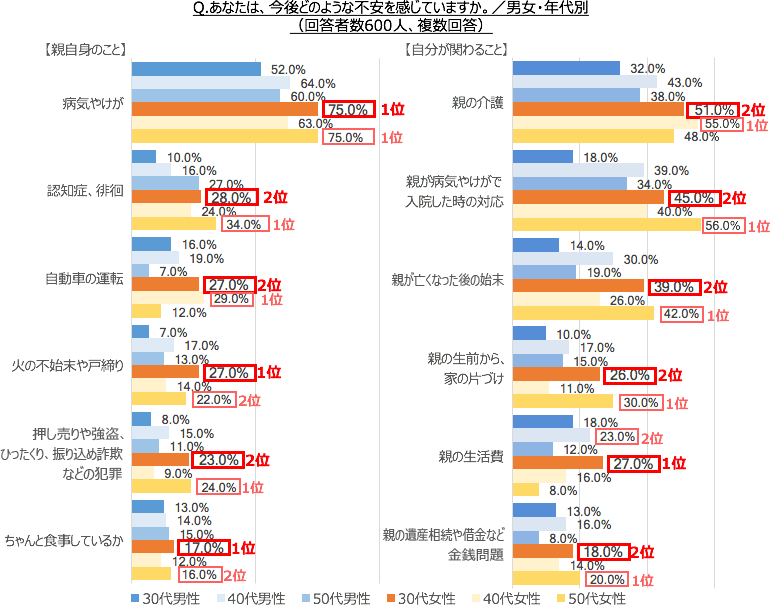 一方、30代女性も多くの不安を抱えていることが浮かび上がりました。<親自身のこと>では、「病気やけが」、 「認知症、徘徊」、「火の不始末や戸締り」など、<自分が関わること>では「親が病気やけがで入院した時の対応」「親が亡くなった後の始末」、「親の生前からの家の片づけ」など、50代の女性と並んで多いことが分かりました。