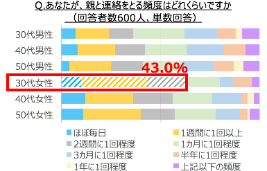 30代女性は、全ての年代・性別の中で最も親との連絡頻度が高く(2週間に1回以上連絡する人が43.0%)、スマートフォンを持っている親と電話、メール、LINEなどで、様々なトピックスについて連絡を取り合っており、ほかの年代・性別よりも親と親密な関係にあることが推察できます。こうした結果から、30代女性は親のちょっとした変化に気付きやすく、それによって不安を感じてしまうのかもしれません。