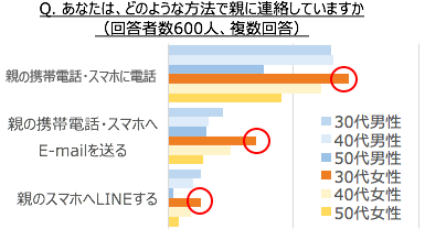 30代女性は、ほかの年代より高頻度で、様々なトピックスについて、親とスマートフォンを使って連絡している。