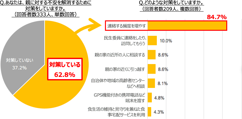 親に対する不安があると回答した人に、不安を解消するためにしている対策を聞いたところ、62.8%の人が何かしらの対策をしており、対策していない人は37.2%でした。対策の内容は、主に「連絡する頻度を増やす」(84.7%)で、すぐに実行しやすい対策をとっていることがわかりました。